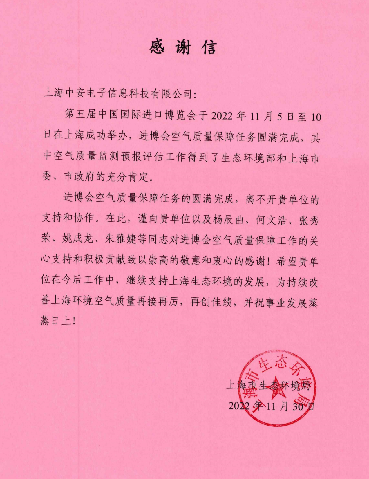 上海環監中心就中安科技在21年國際進博會空氣質量監測預報工作中杰出貢獻送來感謝信?。?021/12/31)