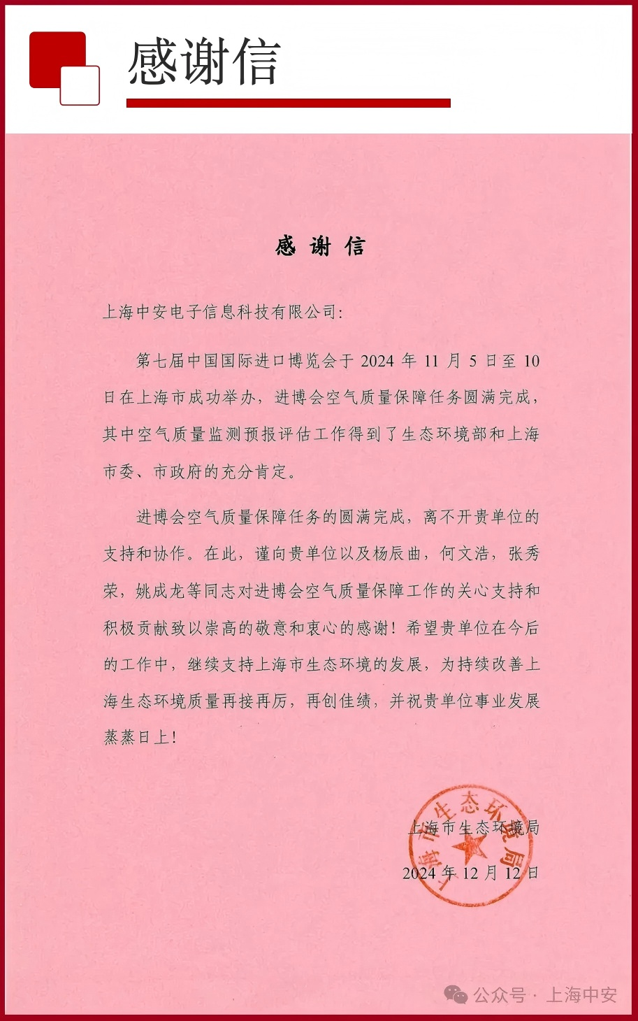 上海市生態環境局致上海中安的一封感謝信?。?025-01-10)